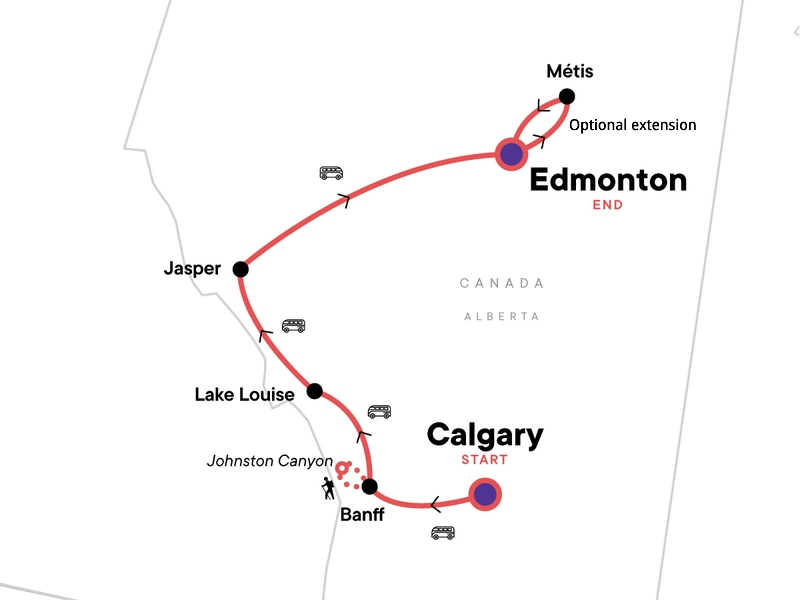 6-night tour begins Calgary ends Edmonton: Fly into Calgary 1 night – Banff 2 nights – Lake Louise 1 night – Jasper 2 nights – Fly home from Edmonton